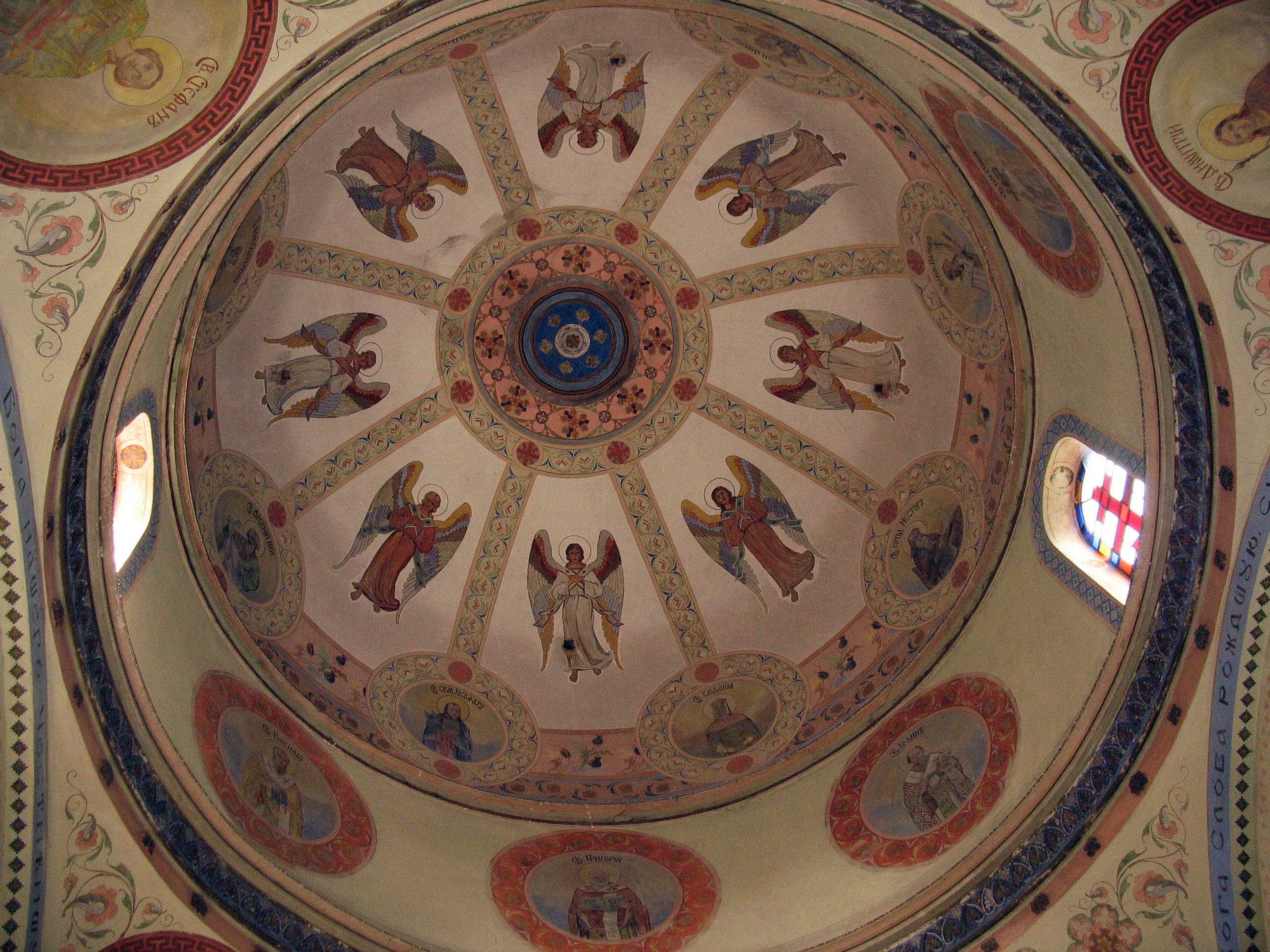 Інтер’єр купола над бабинцем Розмір зображення: 2592:1944 піксел Фото Зенона Боровця, 7 серпня 2006 р. Найчастіше переглядають Фрагмент купола над бабинцем (+) Сили небесні. Стінопис купола (+) Св. Стефан (+) Вкладені елементи 2006 р. Інтер’єр купола Сили небесні. Стінопис купола (+) Фрагмент купола над бабинцем (+) Св. Дмитро (+) Св. Стефан (+)