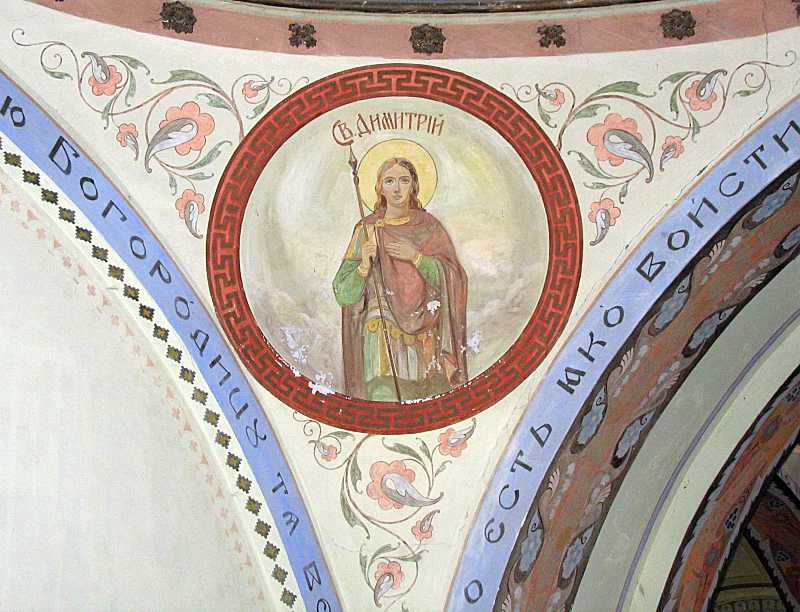 Св. Дмитро Розмір зображення: 800:612 піксел Стінопис паруса бабинця. Фото Зенона Боровця, 7 серпня 2006 р. Вкладені елементи Півпостать св. Дмитра