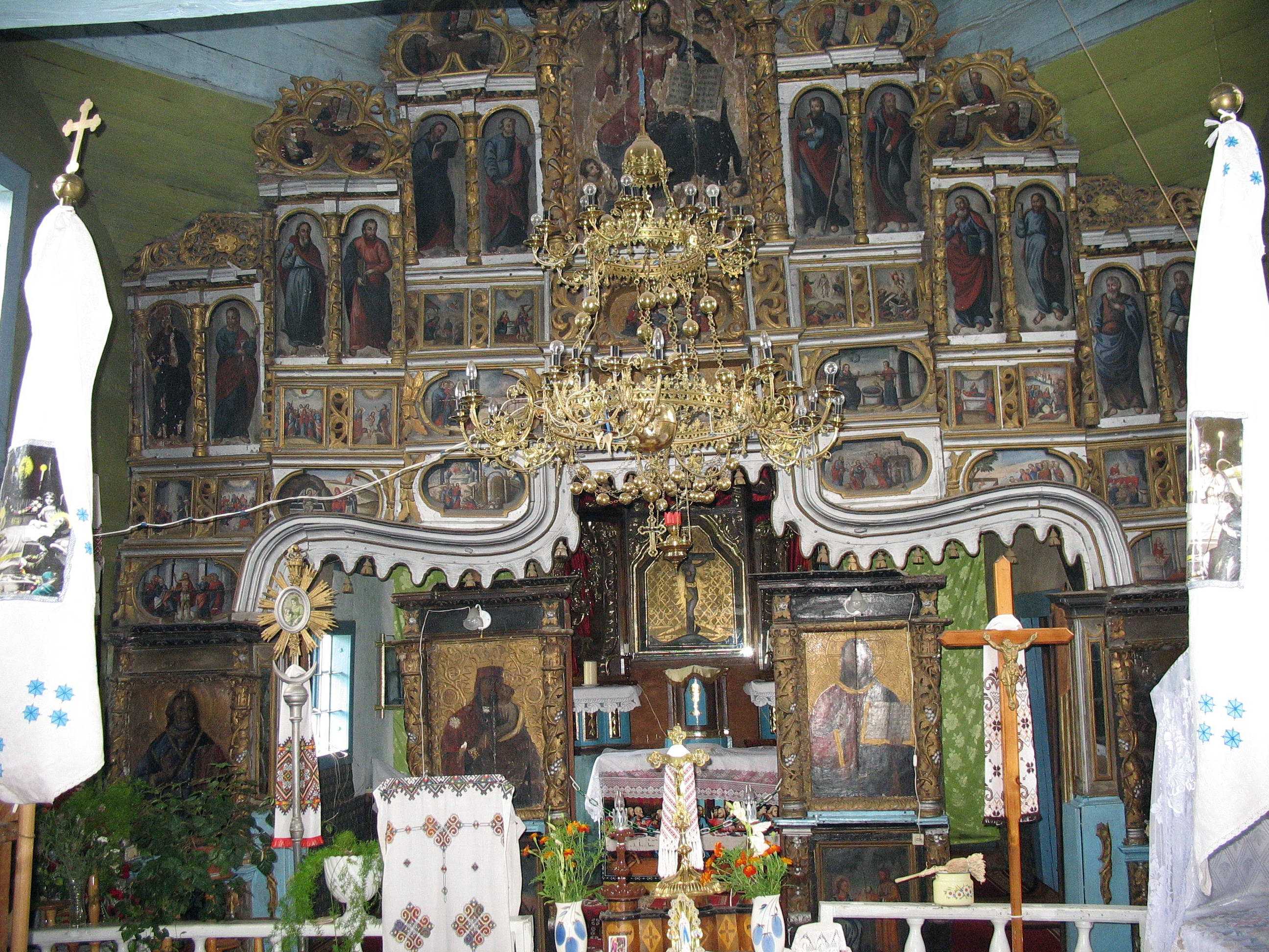 Іконостас Розмір зображення: 2592:1944 піксел Фото Зенона Боровця, 7 серпня 2006 р. Вкладені елементи Ліва частина іконостаса Центральна частина іконостаса Ікона «Богородиця замилування» (до реставрації) (+) Ікона «Втеча до Єгипту» 2011 р. Центральна частина намісного ряду (+) Ікона «Христос учитель» (до реставрації) (+) Ікона «Сатана спокушає Ісуса» Ікона «Вознесіння Марії» Ікона «Зустріч Марії та Єлизавети»