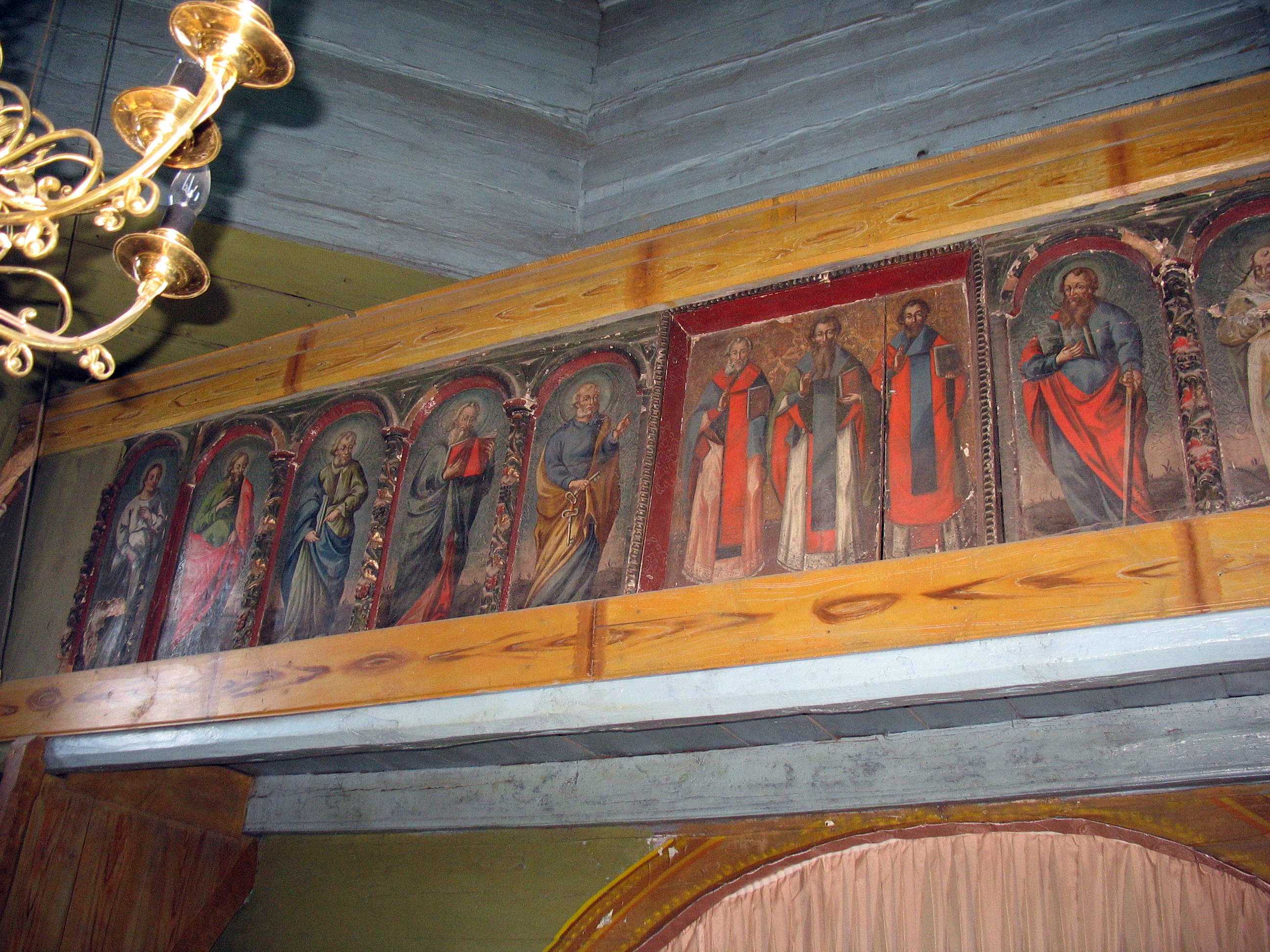 Апостольський ряд з іконостасаРозмір зображення: 2592:1944 піксел Ліва і середня частини. Фото Зенона Боровця, 29 липня 2008 р. |