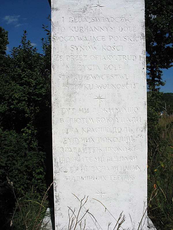 Український напис: «Тут ми лежило, що в лютім бою упали для кращої долі будучих поколінь. Згадайте ж, прохожі, що житє ми віддали, щоб ви не зазнали наших надмірних терпінь».