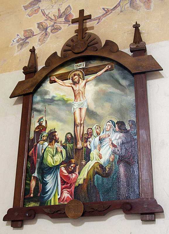 Ікона «Розп’ятт» у кіотіРозмір зображення: 578:800 піксел Вона знаходитьня на торцевій стіні трансепта ліворуч від потрійого вікна. Фото Зенона Боровця і Богдана Тхора, 9 липня 2014 р. |