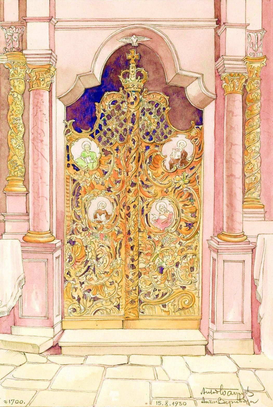 1930 р. Царські вратаРозмір зображення: 1050:1565 піксел Рисунок Антона Вариводи (Краків), 15.10.1930 р. 1700 Church, Hodiv (Hodow) Zolochiv. Baroque doors (royal gates) of the iconostasis. |