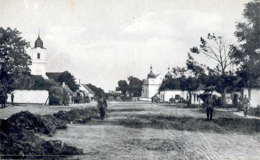 1916 р. (?) Панорама центруРозмір зображення: 845:521 піксел Австрійська поштівка 1916 (?) р. з підписом «Голоби (Росія)» з альбому «Дубенський форт-застава» Ліворуч – костел св. Михаїла, праворуч – церква св. Георгія. |