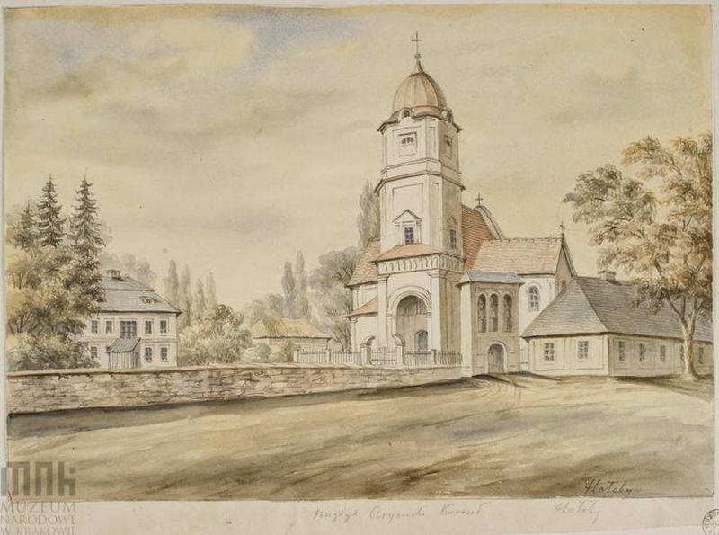 Kościół parafialny p.w. św. Michała archanioła. Widok fasady jednowieżowego kościoła z transeptem; w ogrodzeniu trzya… dzwonnica-brama; z lewej strony dwukondygnacjowy budynek plebanii. 1862 – 1876. Napis: Holoby. Niegdyś Aryański Kościół. Holoby; napis na podkładzie: Wołyń Rys. ołówkiem podmalowany akwarelą, 21,5x28,5. III-r.a. 4163 (Teka Wołyń) [Katalog rysunków architektonicznych ze zbiorów Muzeum narodowego w Krakowie. 1. Rysunki Napoleona Ordy / Opracowały Zofia Kucielska i Zofia Tobiaszowa. – Warszawa: Państwowe wydawnictwo naukowe, 1975, Nr. 233]