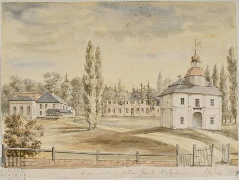 Ruiny pałacu Wilgów. Widok od strony wjazdu. Z prawej strony dwukondygnacjowy budynek bramny, kryty dachem łamanym, zwieńczony drewnianą kopuła z latarnią; z lewej strony dwukondygnacjowy pawilon; w głębi ruiny pałacu. Napis: Brama i Ruiny Pałacu familij Wilgów – Hołoby – Podho… [nieczytelne]; napis na podkładzie: Wołyń, Hołoby. 1862-1876. Rys. ołówkiem podmalowany akwarelą. 21,3 x 28,5 cm. Muzem Narodowe, Kraków. III-r.a. 4162 (Teka Wołyń). [Katalog rysunków architektonicznych ze zbiorów Muzeum narodowego w Krakowie. 1. Rysunki Napoleona Ordy / Opracowały Zofia Kucielska i Zofia Tobiaszowa. – Warszawa: Państwowe wydawnictwo naukowe, 1975, Nr. 234]
