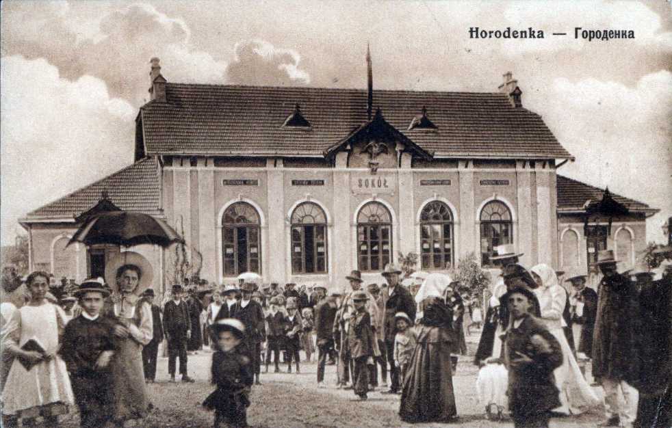 Поштівка: будинок польського спортивного товариства «Сокіл». – Horodenka, [gmach Towarzystwa Gimnastycznego «Sokół»] = Gorodenka. W Horodence : nakładem Ch. Treibicz, [ca 1910] (pocztówka); 9 × 13 cm