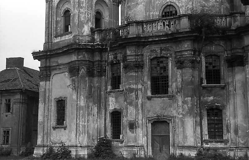1992 р. Нижня частина головного фасаду. Вигляд з позиції С3Розмір зображення: 800:515 піксел 1992 р. 22 червня. Фото М.І.Жарких. Негатека, № 773-08. |