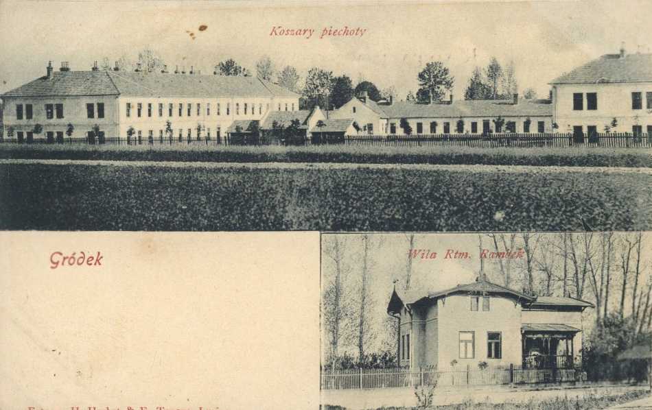 Поштівка: казарми піхоти; віла ротмістра Камбека. Gródek Jagielloński : nakł. M. Metzgera, [1920-1926] (Kraków : Zakłady Reprodukcyjne «Akropol») 9 × 13 cm