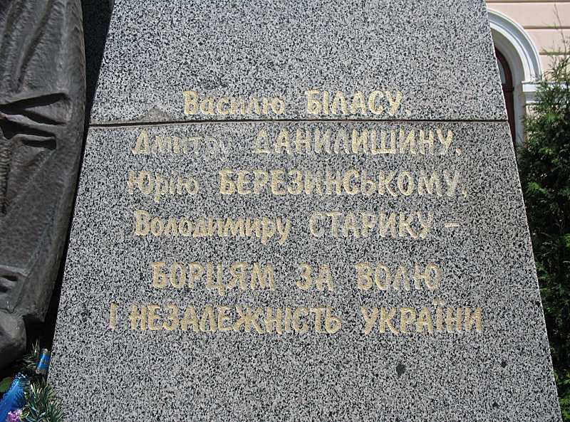 Напис: «Василю Біласу, Дмитру Данилишилу, Юрію Березовському, Володимиру Старику – борцям за волю і незалежність України».