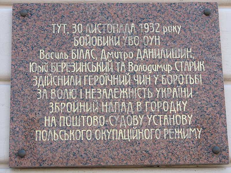 Напис: «Тут 30 листопада 1932 р. бойовики ОУН Василь Білас, Дмитро Данилишин, Юрій Березинський та Володимир Старик здійснили героїчний чин у боротьбі за волю і незалежність України – збройний напад в Городку на поштово-судову установу польського окупаційного режиму».»