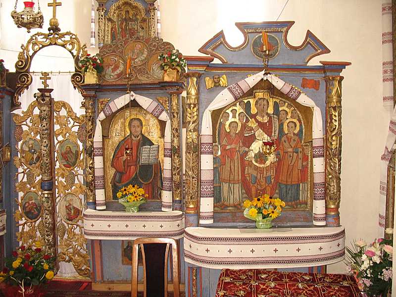 Права частина іконостасу Розмір зображення: 800:600 піксел Фото Зенона Боровця і Богдана Тхора, 6 серпня 2011 р. Вкладені елементи Пророки Мойсей, Ієремія, Даниїл Ікона «Собор архангелів Михаїла і Гавриїла»