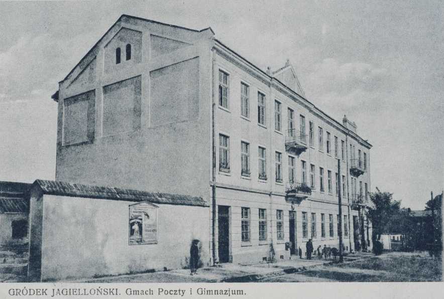 Поштівка: будинок пошти та гімназії. Gródek Jagielloński, gmach poczty i gimnazjum. – Gródek Jagielloński : nakł. M. Metzgera, [1920-1926] (Kraków : Zakłady Reprodukcyjne «Akropol»); 9 × 13 cm