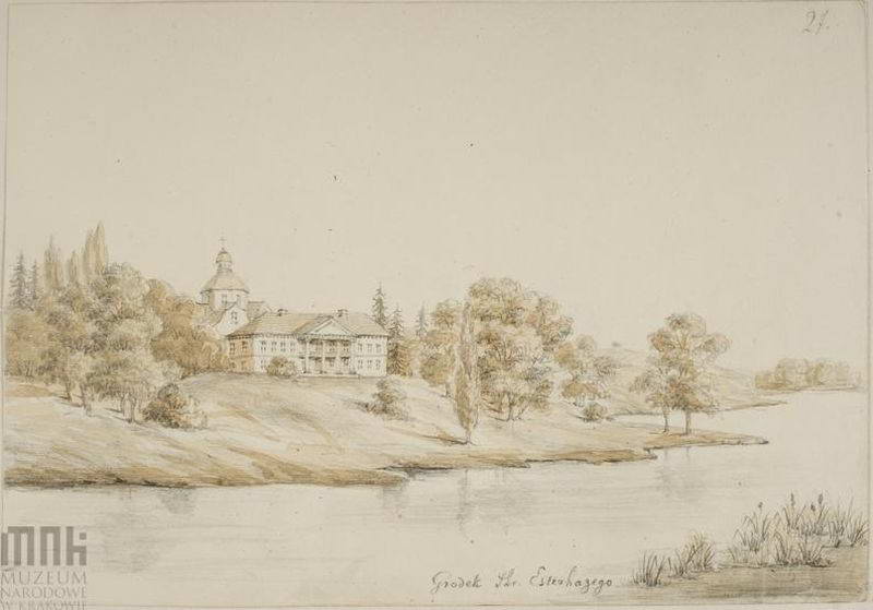 Pałac Esterhazych. Widok od strony rzeki Ustii. Pałac dwukondygnacjowy z portykiem kolu… w wielkim porządku i balkonem; za pałacem fragment cerkwi z kopułą na skrzy… naw. 1862- 1876. Napis: Gródek Hr. Esterhazego; napis na podkładzie: Gródek Rys. ołówkiem podmalowany sepią, 20,5x29,5. III-r.a. 4160 (Teka Wołyń) [Katalog rysunków architektonicznych ze zbiorów Muzeum narodowego w Krakowie. 1. Rysunki Napoleona Ordy / Opracowały Zofia Kucielska i Zofia Tobiaszowa. – Warszawa: Państwowe wydawnictwo naukowe, 1975, Nr. 217]