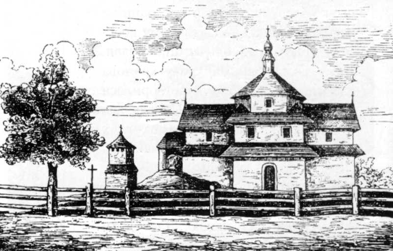 Дерев’яна церква, зведена 1869 року стараннями ігумена Христинопільського василіянського монастиря о. Ігната Кучинського. Це була одноверха будівля галицького типу. Складалася з трьох прямокутних зрубів вівтаря, нави й бабинця, з них зруб нави був ширший. Вужча гранчаста апсида, прилягала до східної стіни вівтаря, що притаманне радше мурованому, а не дерев’яному будівництву. Гребені двосхилих причілкових дахів вівтаря і бабинця сягали середини низького світлового восьмерика над навою, покритого восьмибічним наметом зі сліпим ліхтарем і маківкою. Оперізувало будівлю вузьке піддашшя, з’єднане з п’ятисхилим дахом апсиди. Храм згорів під час Першої світової війни.