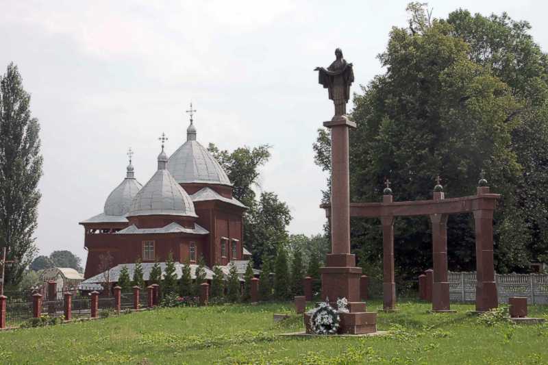 2012 р. Колона зі скульптурою Покрови на тлі церквиРозмір зображення: 800:533 піксел Фото Богдана Тхора, 4 серпня 2012 р. |
