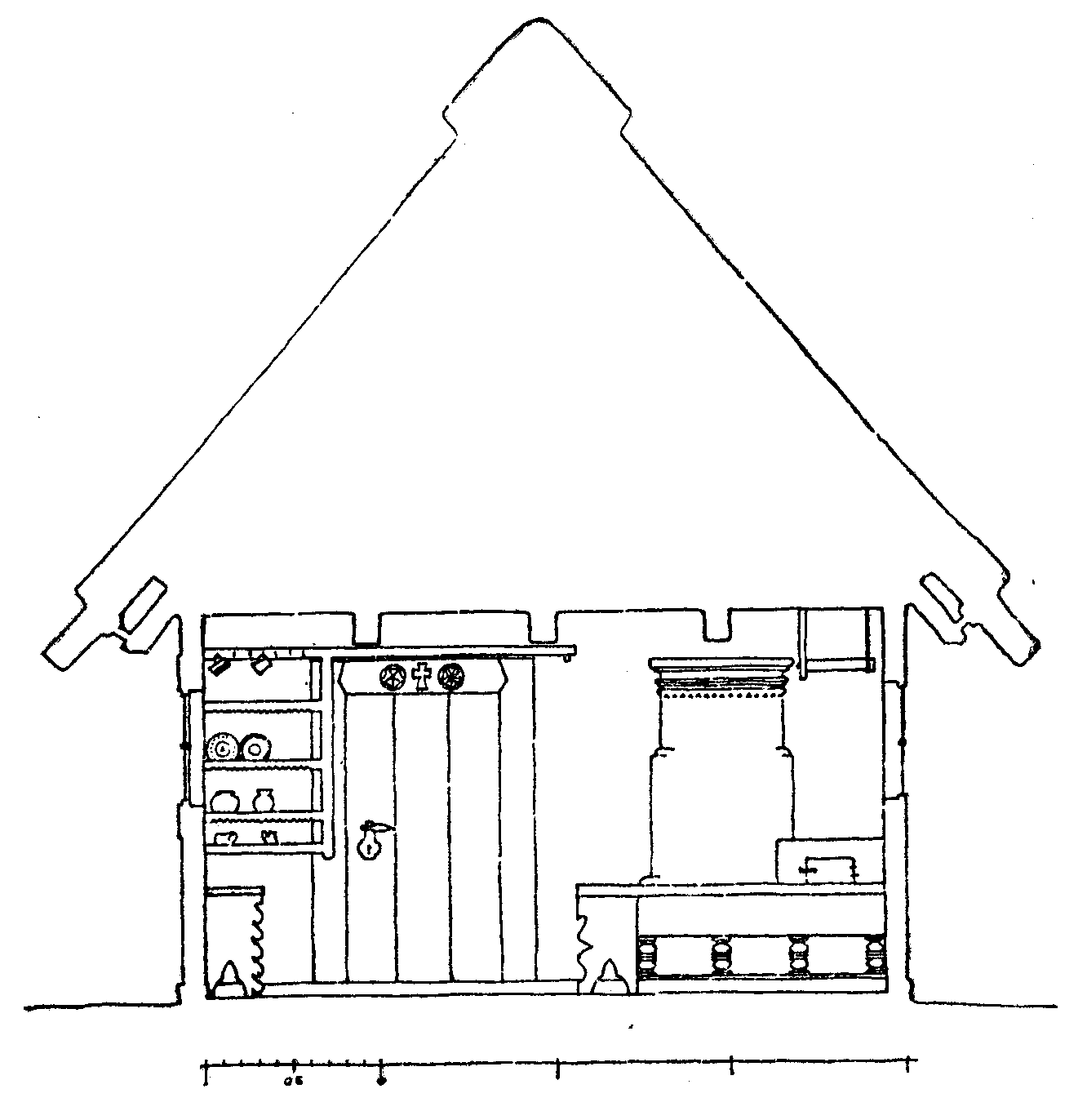 Хата в с. Гряда, Львівщина. РозрізРозмір зображення: 1332:1372 піксел Джерело: Юрченко П.Г. Дерев’яне зодчество України. – К.: 1949 р., с. 72. |