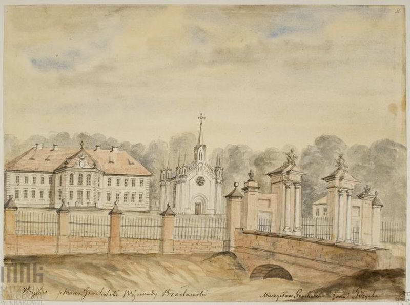 Pałac Grocholskich. Widok od strony bramy wjazdowej. Pałac dwukondygnacjowy z wieloboc… zalitem; z prawej strony kaplica z sygnaturką nad wejściem, wielobocznymi… i sterczynami na narożach; w ogrodzeniu brama wjazdowa, przed którą mostek… 1876. Napis: Hryców p. Marcin Grochołski Wojewoda Bracławski; Mieczysław G. żona Giżycka; napis na podkładzie: G. Wołyńska. Hryców. Rys. ołówkiem podmalowany akwarelą, 20,5x27,8. III-r.a. 4169 (Teka Wołyń). [Katalog rysunków architektonicznych ze zbiorów Muzeum narodowego w Krakowie. 1. Rysunki Napoleona Ordy / Opracowały Zofia Kucielska i Zofia Tobiaszowa. – Warszawa: Państwowe wydawnictwo naukowe, 1975, Nr. 249]