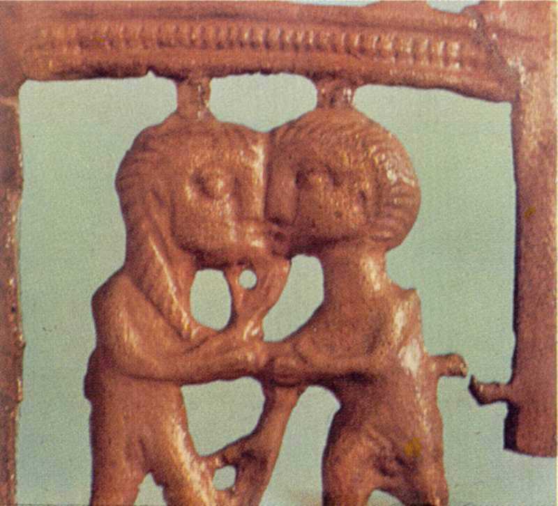 ФрагментРозмір зображення: 800:726 піксел Фрагмент бронзового окуття піхов меча (І ст. н.е., с. Гринів Львівської обл.). Джерело: Історія української культури. – К.: 2001 р., т. 1, с. 628. |
