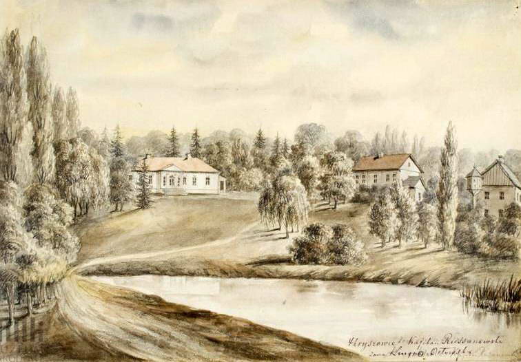 Dwór Russanowskich. Widok od strony stawu. Dwór parterowy z gankiem; z prawej strony pa… oficyna i zabudowania gospodarcze. 1871—1873. Napis: Hryszowce Kajetan Russ… żona Lucyna Orłowska; napis na podkładzie: Podole Hryszowce. Rys. ołówkiem podmalowany akwarelą, 19,4x28,1. III-r.a. 2968 (Teka Podole). [Katalog rysunków architektonicznych ze zbiorów Muzeum narodowego w Krakowie. 1. Rysunki Napoleona Ordy / Opracowały Zofia Kucielska i Zofia Tobiaszowa. – Warszawa: Państwowe wydawnictwo naukowe, 1975, Nr. 252]
