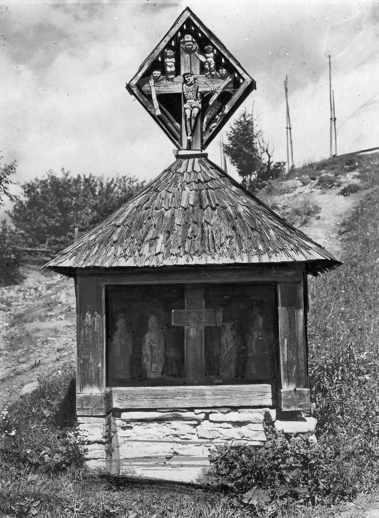 Дерев’яна придорожна каплиця. Фото невідомого часу (1918..1934 рр.) опубліковано на сторінці «Мандрівка старим кордоном» 30.01.2022 р.