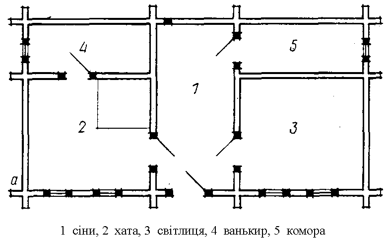 1 – сіни, 2 – хата, 3 – світлиця, 4 – ванькир, 5 – комора.
