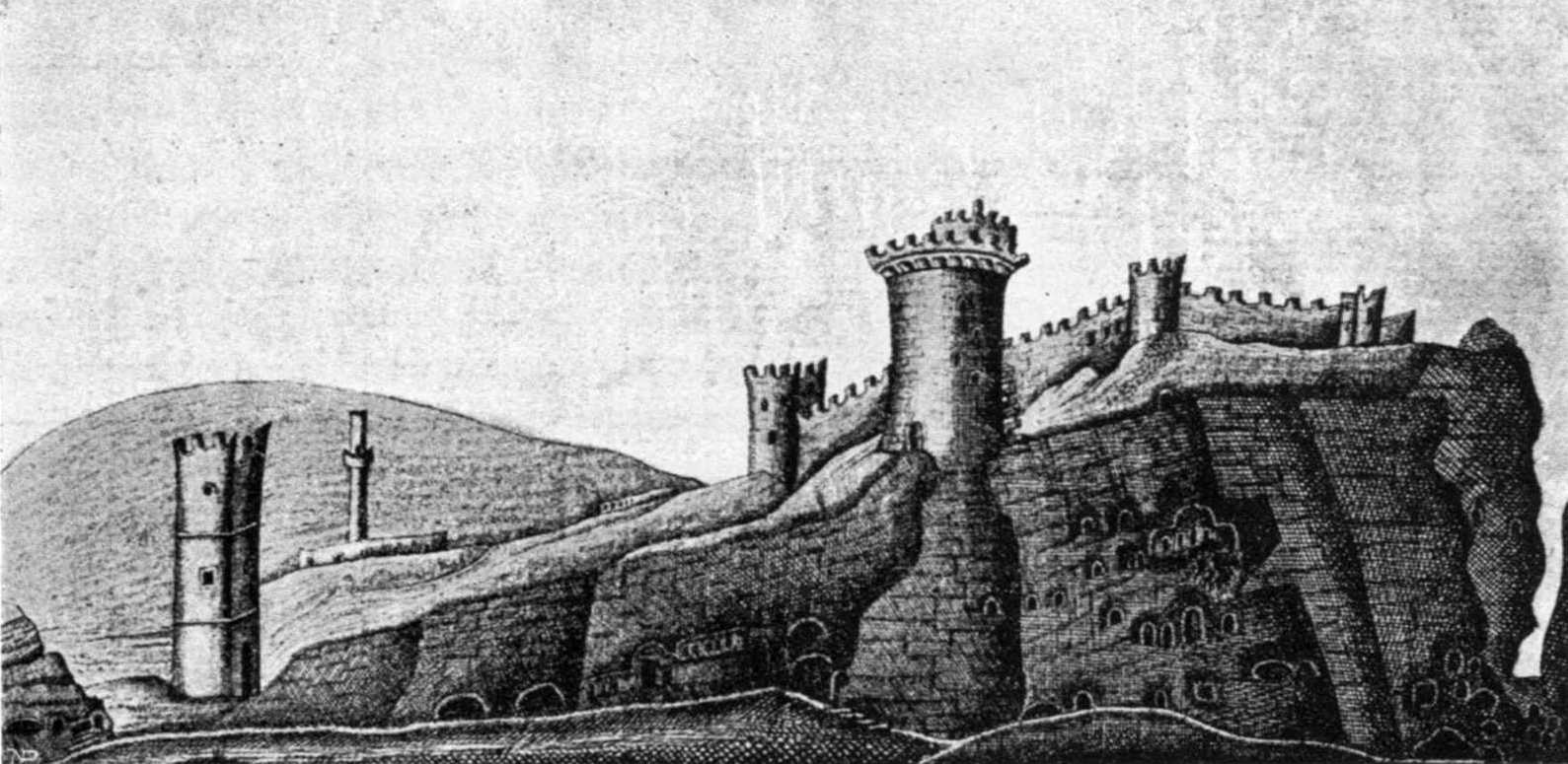 1783 р. Загальний вигляд фортеці ІнкерманРозмір зображення: 1589:775 піксел Мал. П. Гріненталя, 1783 р. [Гайворонський О. Країна Крим. – К.: Майстер книг, 2017 р., c. 237] |