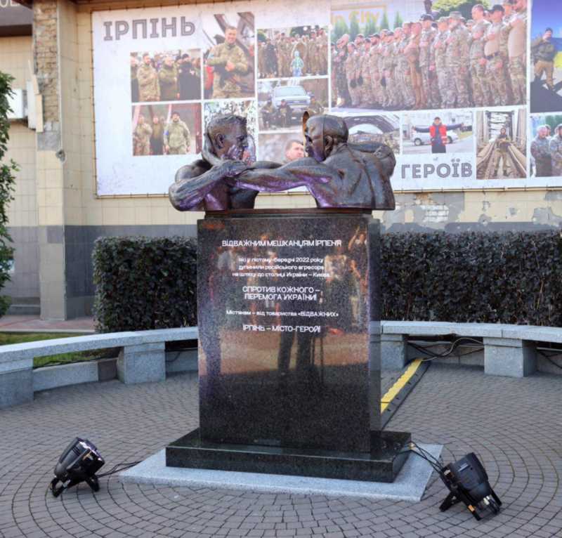 Напис на постаменті: «Відважним мешканцям Ірпеня, які у лютому – березні 2022 р. зупинили російського агресора на шляху до столиці України – Києва. Спротив кожного – перемога України. Містянам – від товариства «Відважних». Ірпінь – місто-герой!»