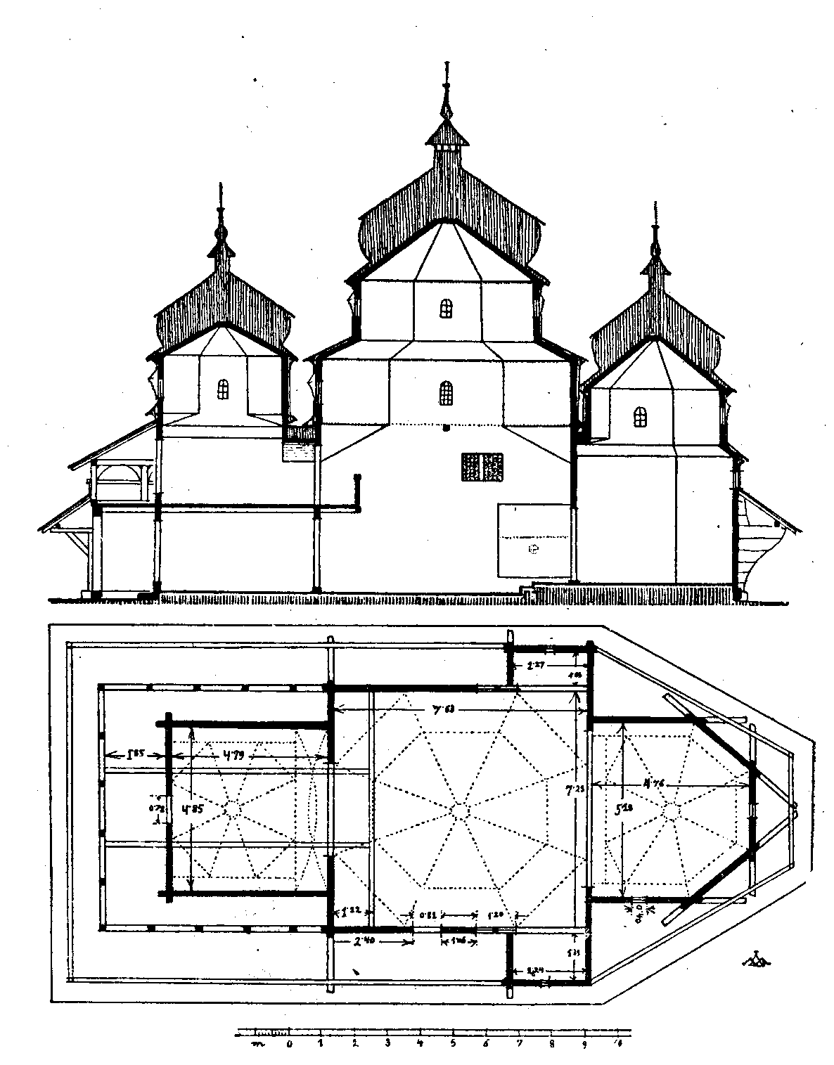 Поздовжній переріз і планРозмір зображення: 1186:1515 піксел Церква 1663 р. (дерев.). Джерело: Драган М. Українські деревляні церкви. – Льв.: 1937 р., т. 2, с. 63. |