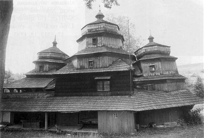 Найдавніші відомості про церкву зустрічаються в документах 1507 р. Існуюча дерев’яна будівля збудована у 1663 р. майстром Іллею Пантелимоном та відновлювалась у 1801 p., як свідчать написи на одвірках та зрубах. Візитатор 1766 р. відзначав, що всі три верхи були тризаломними. Тепер це тризрубна триверха церква, восьмерикові верхи якої (над навою з одним заломом) увінчані цибулястими банями. Над бабинцем на другому ярусі влаштована емпора з відкритою аркадою-галереєю. Бароковий іконостас чотириярусний, різьблений і золочений, походить з 1663 р. Поруч розташована дерев’яна чотириярусна дзвіниця, збудована у 1722 р. (дата на одвірку), верхні яруси якої мають аркадові галереї.