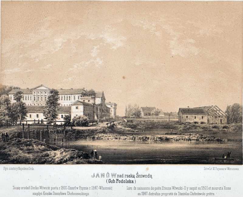 Pałac Chołoniewskich. Widok ogólny od strony rzeki Śniwody. Pałac dwukondygnacjowy z trzykondygnacjową częścią środkową zwieńczoną trójkątnym przyczółkiem; z prawej strony fragment murów obronnych dawnego zamku z budynkiem bramnym i dwiema czworobocznymi basztami z krenelażem; przed pałacem oficyny. 1871 – 1873. Dat.: Janów 1° Czerwca. Napis: X. Stanisław Choloniewski – Józef Chołoniewski; napis na podkładzie: Janów. Tu się urodził Stefan Witwicki poeta r. 1801. umarł w Rzymie 1847. Wlasrtość niegdyś Hrabiego Księdza Choloniewskiego Podole; napis na kartce doklejonej do podkładu: Janów nad rzeką Śniwodą Gub. Podolska. Tu się urodził Stefan Witwicki poeta r. 1801. umarł w Rzymie r. 1847. – Własność niegdyś Księdza Stanisława Choloniewskiego; ostatni napis powtórzony w języku francuskim. Rys. ołówkiem podmalowany akwarelą, 19,3x28,2. III-r.a. 2974 (Teka Podole). Bibl.: Album widoków, seria IV, ii. 132. [Katalog rysunków architektonicznych ze zbiorów Muzeum narodowego w Krakowie. 1. Rysunki Napoleona Ordy / Opracowały Zofia Kucielska i Zofia Tobiaszowa. – Warszawa: Państwowe wydawnictwo naukowe, 1975, Nr. 274]