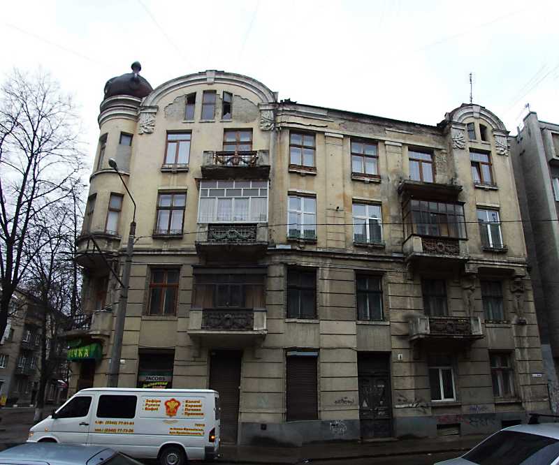 2012 р. Фасад по вул. Гаркуші Розмір зображення: 800:666 піксел 5 квітня 2012 р. Фото М.І.Жарких. Вкладені елементи Ліва частина головного фасаду (+) Права частина головного фасаду Консолі еркера (+)
