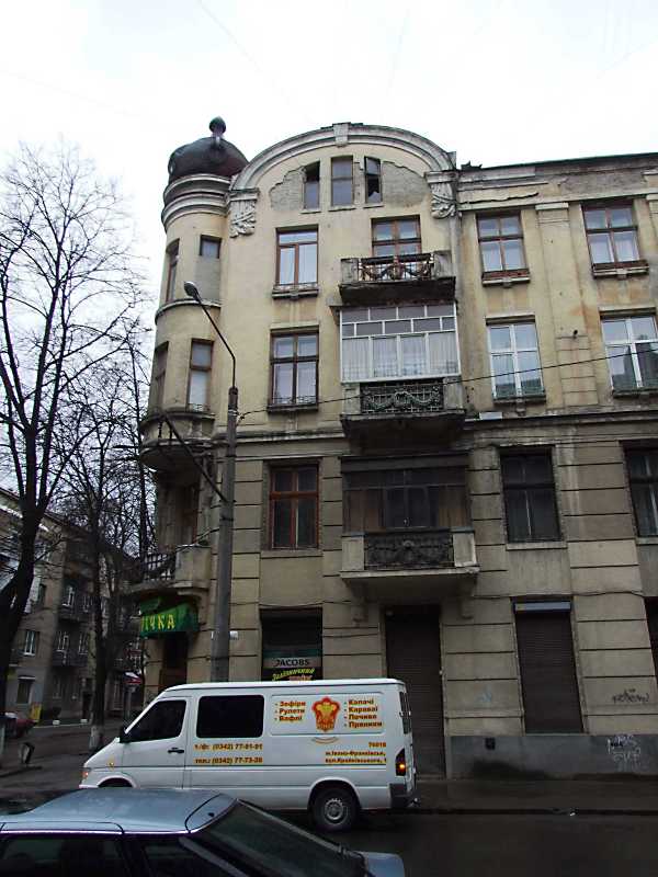 Ліва частина головного фасаду Розмір зображення: 600:800 піксел 5 квітня 2012 р. Фото М.І.Жарких. Вкладені елементи Сецесійний фронтон