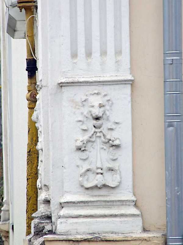 Цоколь пілястри з маскароном лева Розмір зображення: 600:800 піксел 5 квітня 2012 р. Фото М.І.Жарких. Попередня сторінка | Вище | Наступна сторінка