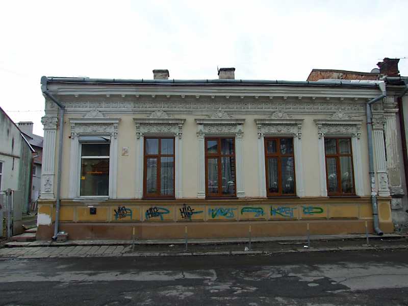 2012 р. Головний фасад Розмір зображення: 800:600 піксел 5 квітня 2012 р. Фото М.І.Жарких. Вкладені елементи Капітель пілястри Цоколь пілястри з маскароном лева Сандрик вікна