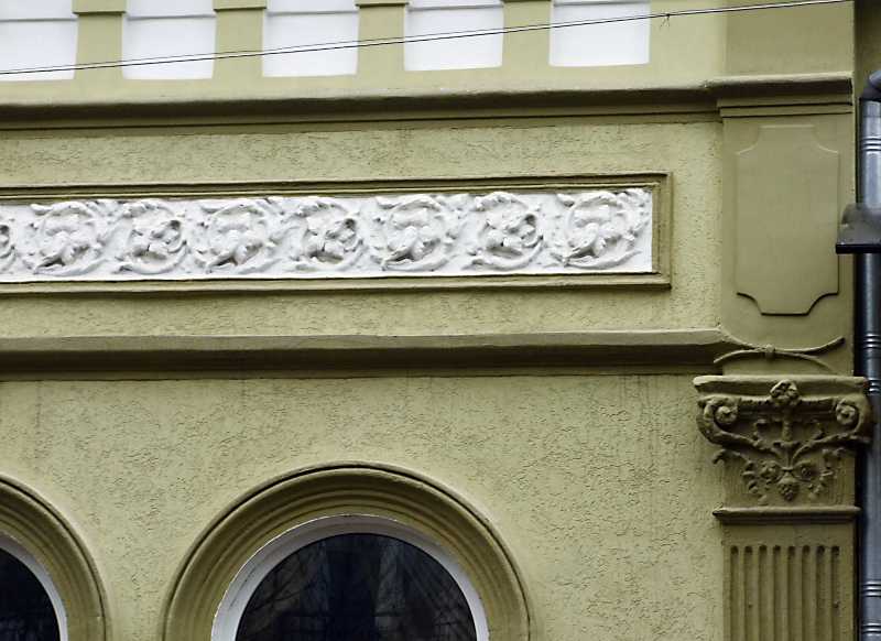 2012 р. Фрагмент декору фасаду буд. № 11а Розмір зображення: 800:582 піксел 5 квітня 2012 р. Фото М.І.Жарких. Вище | Наступна сторінка