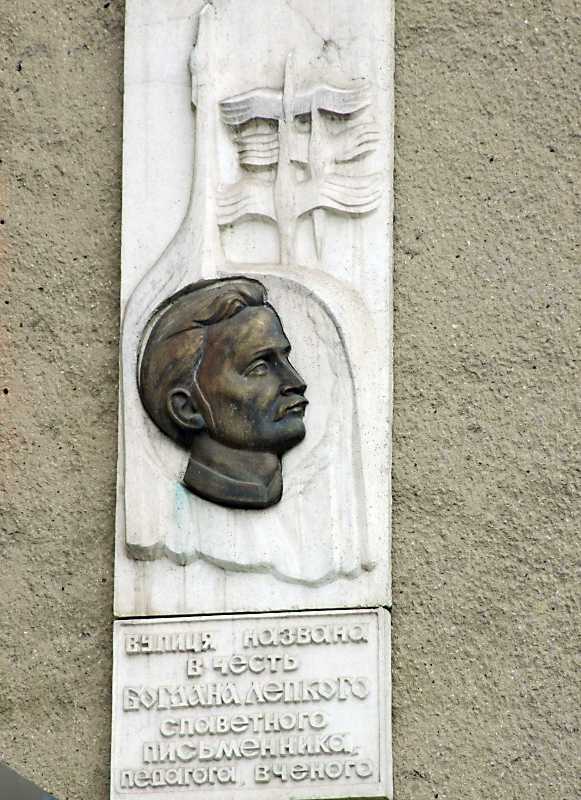 Меморіальна дошка Б.ЛепкомуРозмір зображення: 581:800 піксел 5 квітня 2012 р. Фото М.І.Жарких. На дошці напис: «»Вулиця названа в честь Богдана Лепкого, славетного письменника, педагога, вченого. |