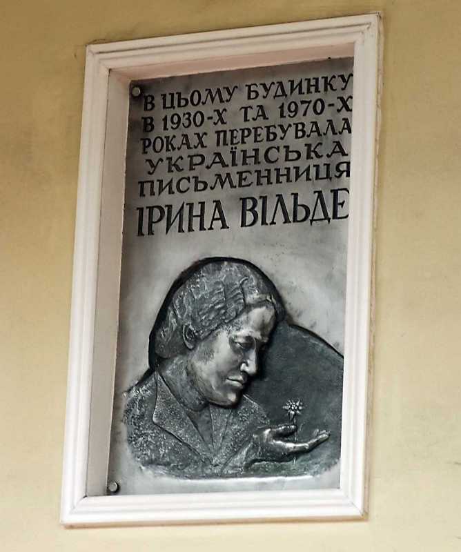 На дошці напис: «В цьому будинку в 1930-х та 1970-х роках перебувала українська письменниця Ірина Вільде».