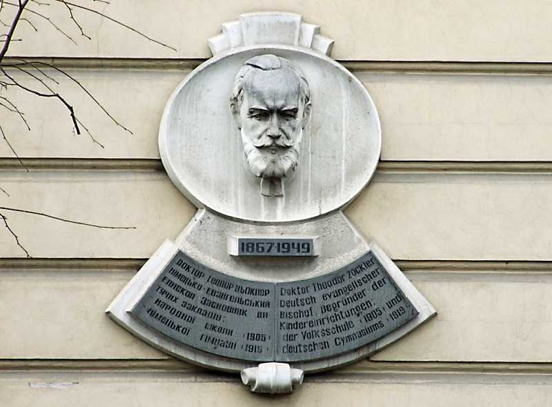 На дошці напис: «1867 – 1949 Доктор Теодор Цьоклер, німецько-євангельський єпископ, засновник дитячих закладів: народної школи 1905 р.; німецької гімназії 1919 р.» (+ те саме німецькоїю мовою).