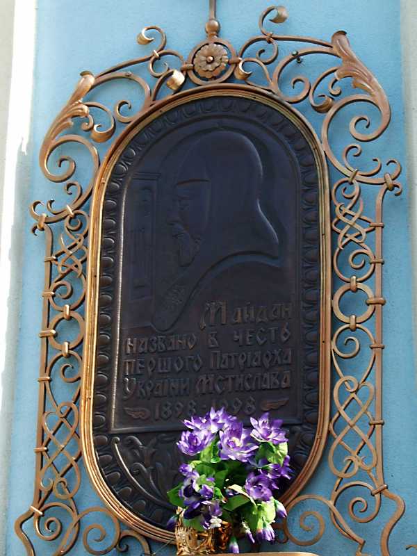 Меморіальна дошка патріарху МстиславуРозмір зображення: 600:800 піксел 5 квітня 2012 р. Фото М.І.Жарких. На дошці напис: «Майдан названо на честь першого патріарха україни Мстислава (1898 – 1998)». |