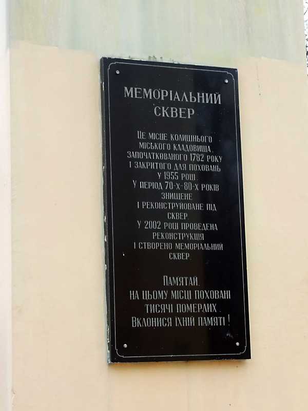 На дошці напис: «Меморіальний сквер. Це місце колишнього міського кладовища, започатковного в 1782 році і закритого для поховань у 1955 році. У період [19]60-70-х років знищене і реконструйоване під сквер. У 2002 році проведена реконструкція і створено меморіальний сквер. Пам’ятай, на цьому місці поховані тисячі померлих. Вклонися їхній пам’яті!».