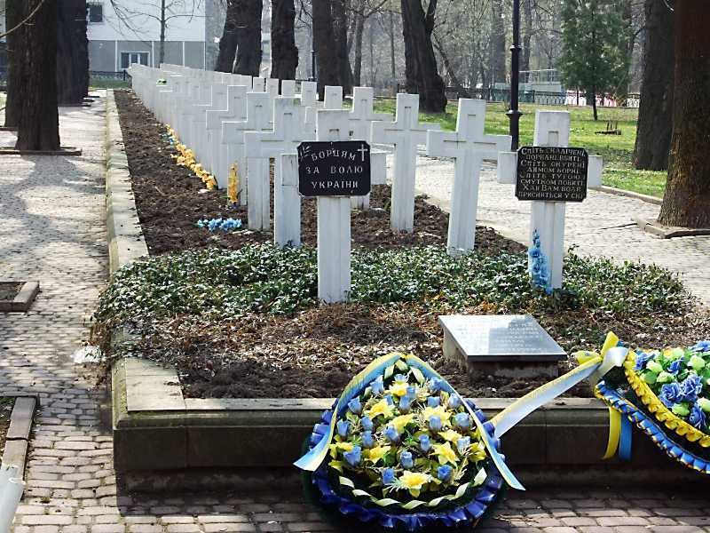 Напис на табличці праворуч: «Спіть скалічені, порвані, вбиті, Спіть окурені димом борні, Спіть тугою і смутком повиті, Хай вам воля присниться у сні!»