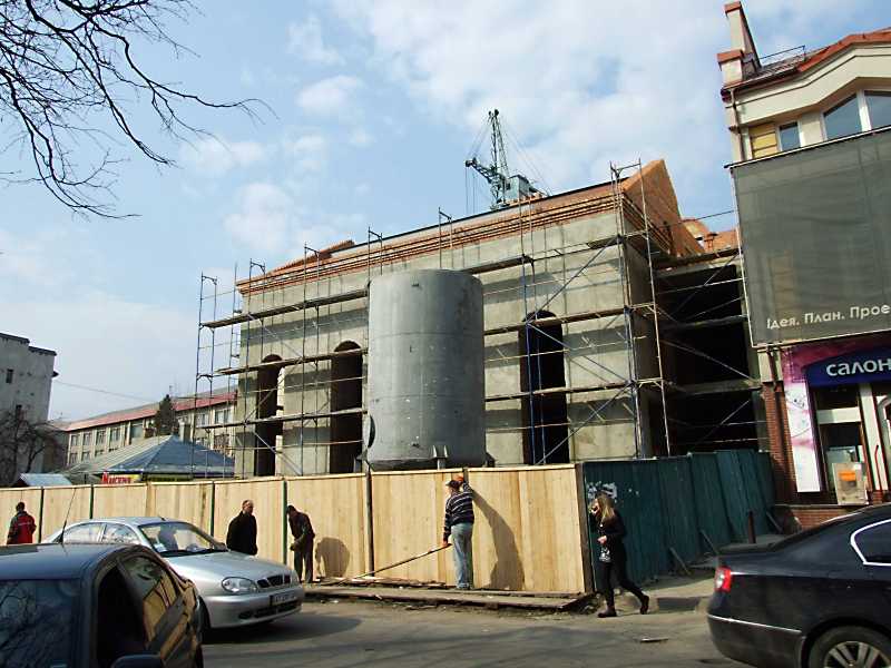Будинок (№ 49)Розмір зображення: 800:600 піксел Вигляд з південного сходу. 5 квітня 2012 р. Фото М.І.Жарких. Новітня «хатинка», яка споруджується на місці зруйновано цеху броварні. |
