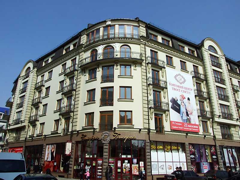 Торговельно-офісний центр (№ 1)Розмір зображення: 800:600 піксел Ліворуч – вул. Галицька, праворуч – пл. Ринок. 5 квітня 2012 р. Фото М.І.Жарких. |