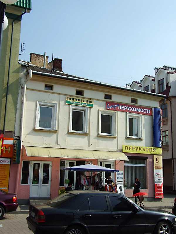 Цей будинок є другим з від півночі на східному боці площі. Таблички з номером на ньому нема, на планах міста він маґ номер 1 по вул. Мельничука. Оце фасад по пл. Ринок. 5 квітня 2012 р. Фото М.І.Жарких.