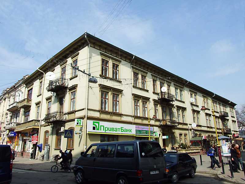 Житловий будинок (№ 9)Розмір зображення: 800:600 піксел Ліворуч – вул. Січових стрільців, праворуч – вул. Бачинського. 5 квітня 2012 р. Фото М.І.Жарких. |