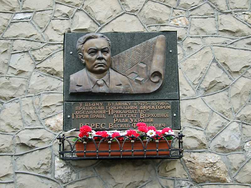На дошці напис: «У цьому будинку за 1975 по 1989 р. працював генеральним директором об’єднання «Прикарпатліс» Герой праці, депутат Верховної Ради україни Верес Василь Федорович»