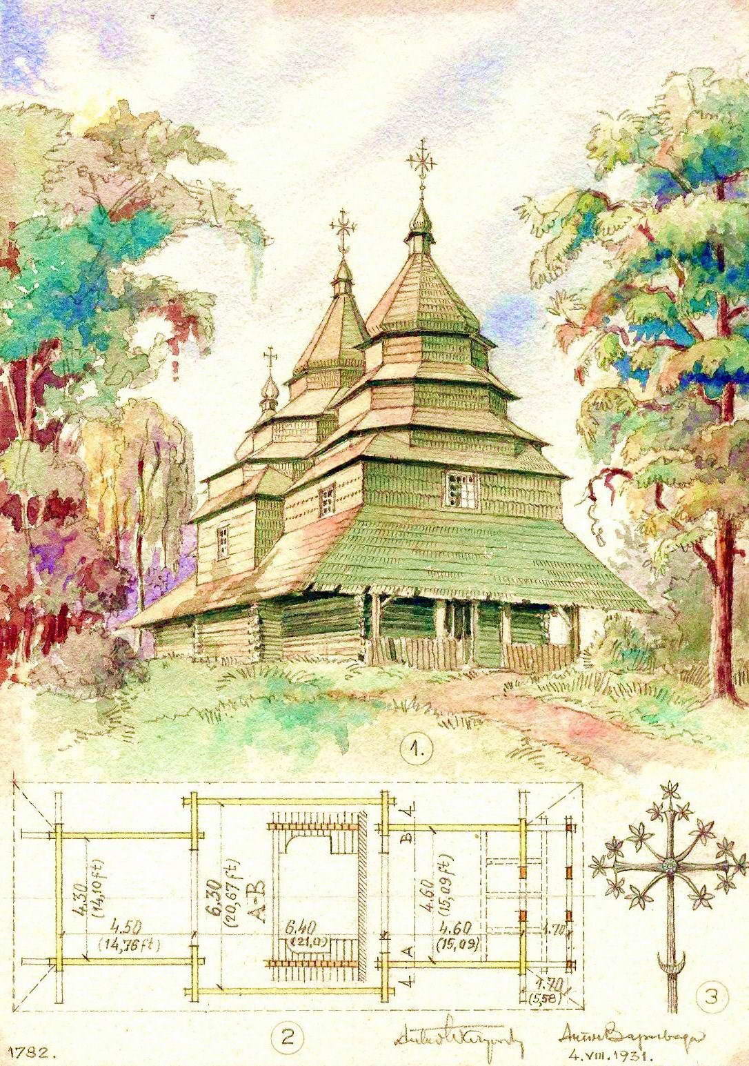 1782 Church, Ivashkivtsi (Iwaszkowce), Turka. 1- Northwestern view; 2 – Ground plan showing section “A-B”; 3 – Forged iron cross.