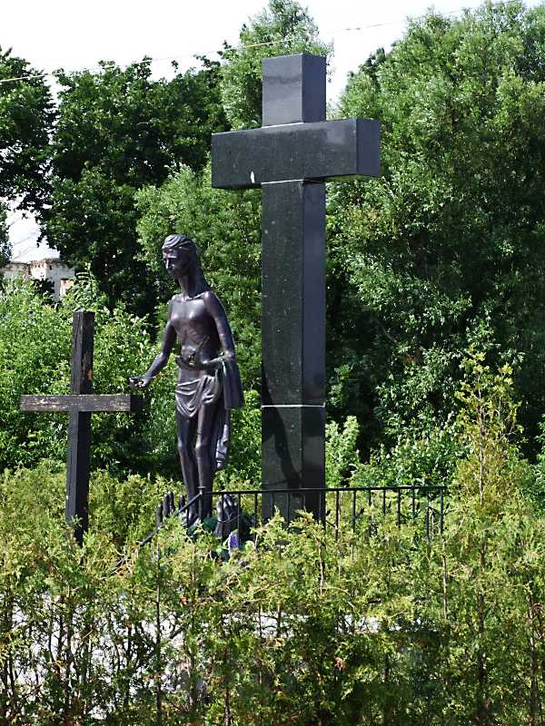Пам’ятний хрест перед каплицею Розмір зображення: 600:800 піксел 26 червня 2011 р. Фото М.І.Жарких. Вкладені елементи Постать