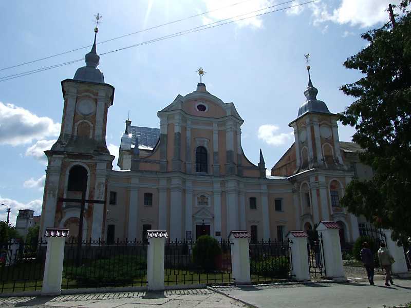2011 р. Костел. Вигляд із заходу Розмір зображення: 800:600 піксел 26 червня 2011 р. Фото М.І.Жарких. Вкладені елементи Ліва (північна) башта Центральна частина головного фасаду (+) Скульптура богородиці Права (південна) башта (+)